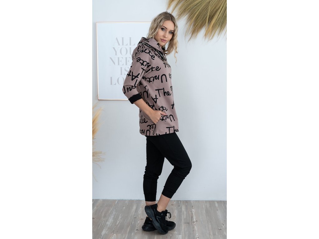 Prodloužená mikina s ozdobnou kapucí se dvěmi kapsami a 3/4 rukávem.